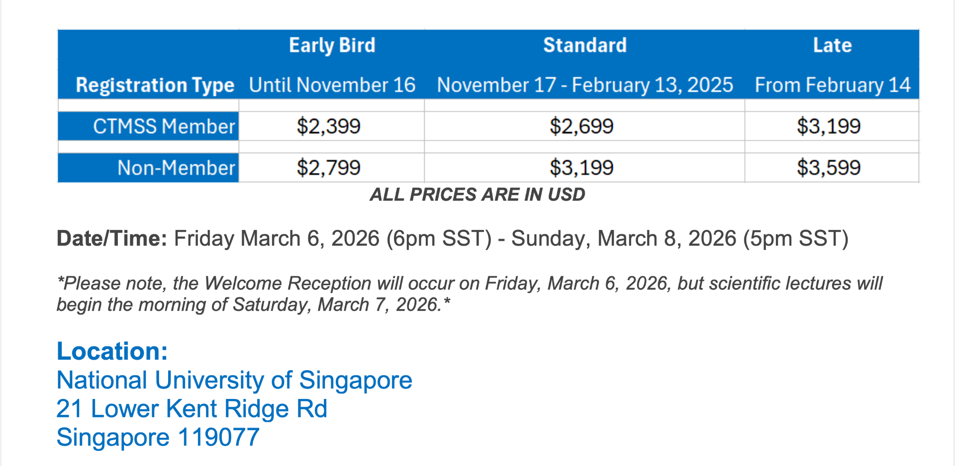 The Singapore course is comprised of general lectures, focus-track lectures, live demonstrations, up to 3 hours of hands-on training, and an open question/answer session with all faculty before completion of a self-directed test. A certificate of completion is issued by the CTMSS following submission of the test.